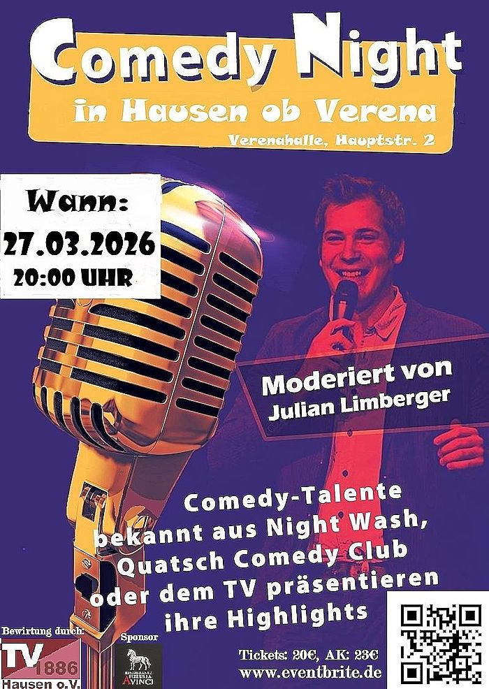 Die nächste Comedy Night findet am 27. März 2026 in Hausen statt und verspricht erneut einen Abend voller Humor und erstklassiger Unterhaltung mit drei neuen Künstlern.